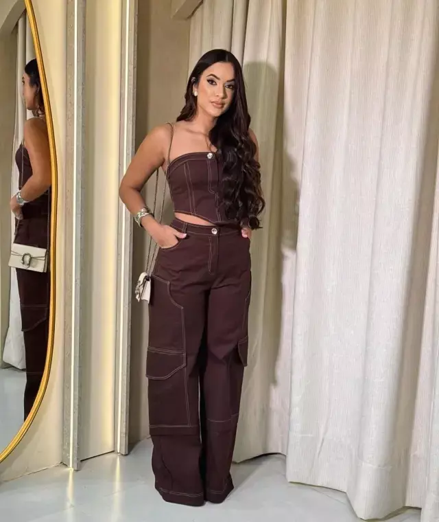 Possui costuras simétricas em toda a peça, zíper, botão e bolsos na parte frontal da calça. Cropped duplo com botão frontal trazendo sofisticação ao modelo, possui também amarração na parte das costas do cropped.